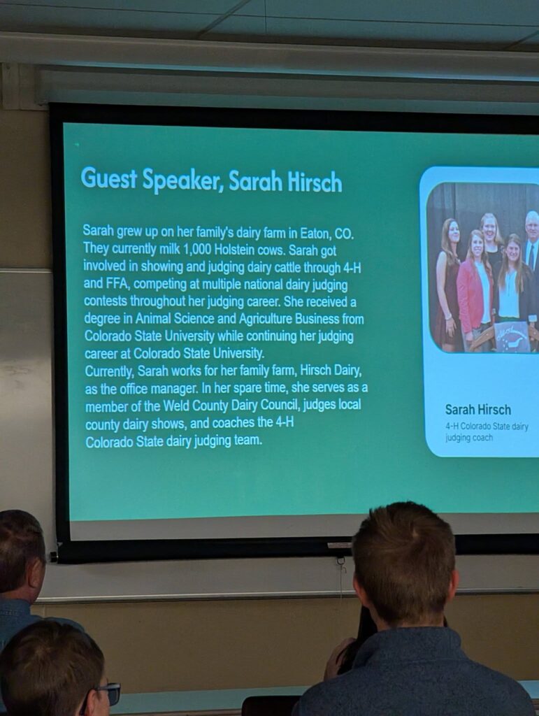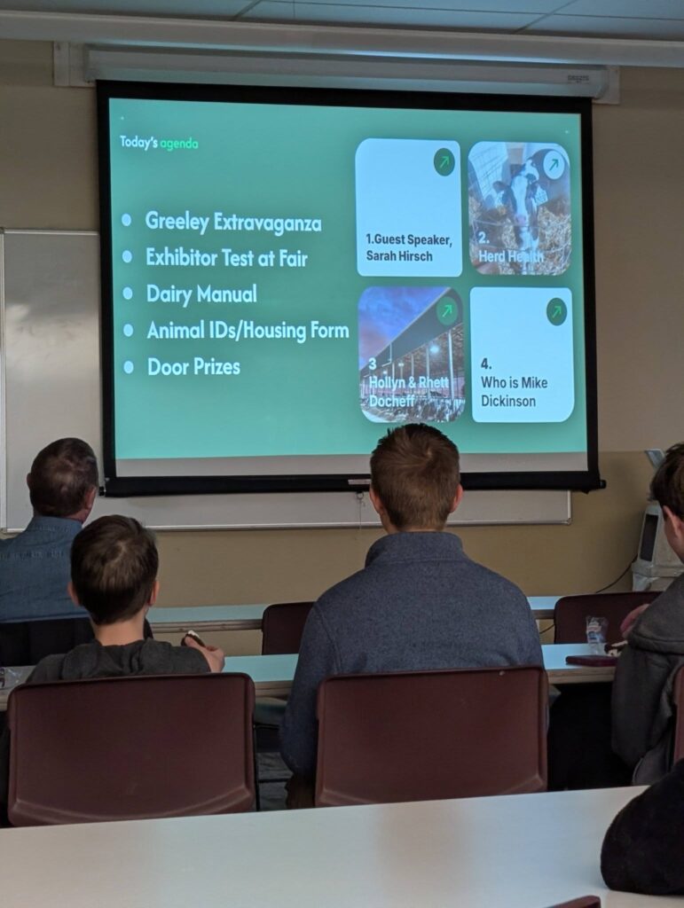 Thank you to all our members that filled our classroom again tonight! We started off with Hollyn, Rhett & Claire talking about living at their dairy farm and their favorite animals. Our guest speaker, Sarah Hirsch talked to us about dairy judging and various dairy careers. We reviewed herd health and talked about Mike Dickinson.